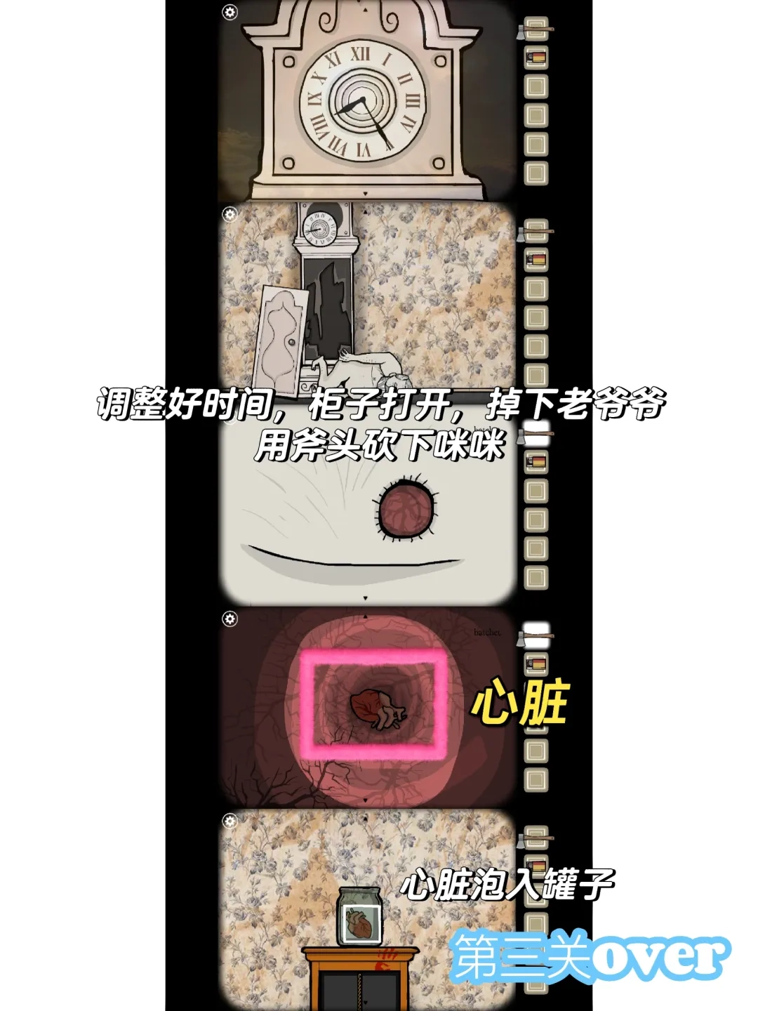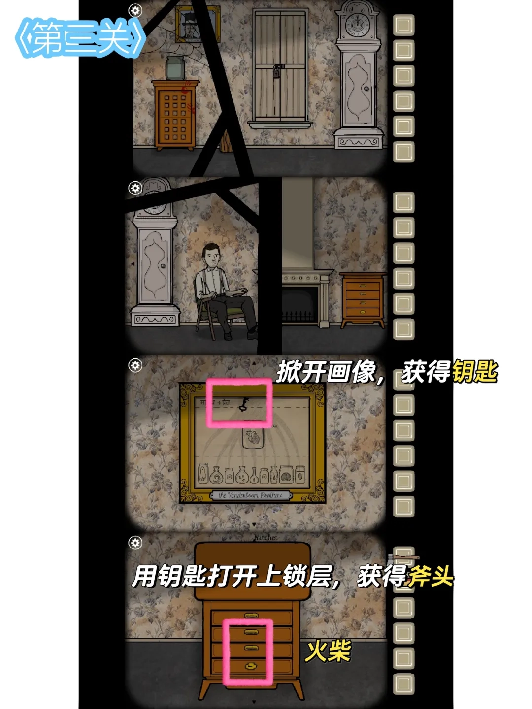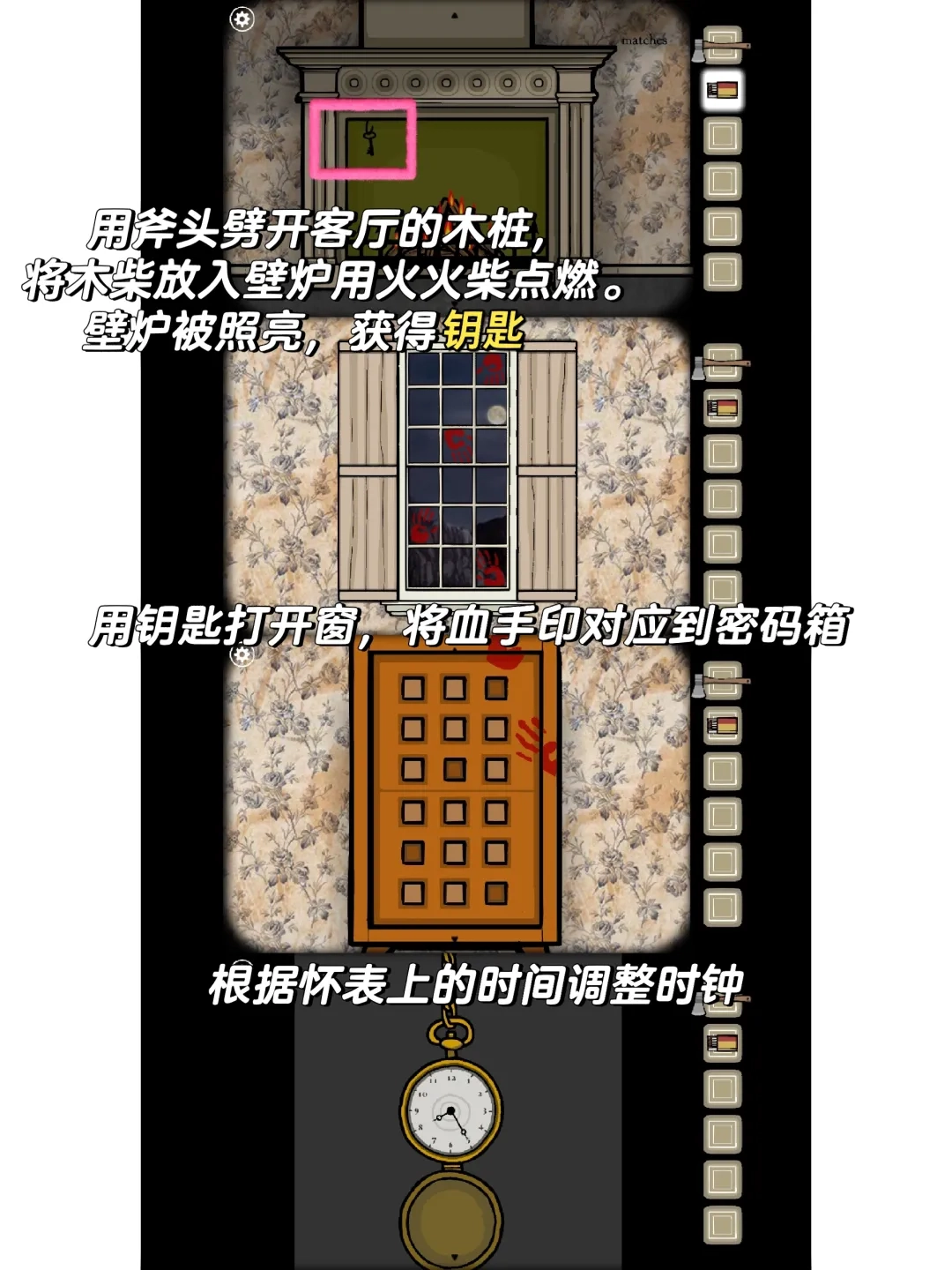 和男人交谈后,了解到他想点燃壁炉。我先把翘边的相片掀开,找到了抽屉钥匙;用这把钥匙打开抽屉,顺利拿到斧头去劈柴;接着划燃火柴点燃柴禾,壁炉里的火渐渐生起来,火光一亮,我看到上方挂着窗户的钥匙。打开窗户,外面有排列规律的血手印,我按照这个规律去开密码箱,打开后里面有一块怀表。我把家里的时钟调整到怀表显示的时间,下方的箱体突然掉出一个老爷爷,最后我取了他的心泡进福尔马林里。