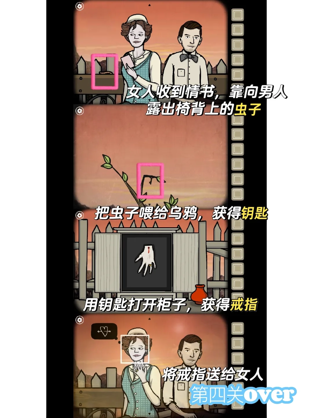 男人站在凳子上,用树枝把房顶上的鸟窝捅了下来,然后把在地上抓到的虫子喂给了窝里的小鸟。接着他把花盆里、鸟窝里和房间里找到的钻石都放进了门上的卡槽,顺利打开了房门。