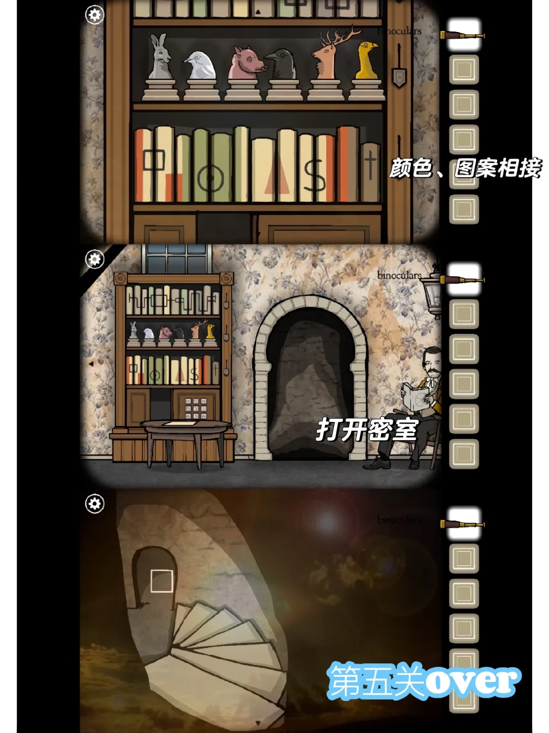 揭下边缘翘起的相片,把桌上的纸张、书籍与相片背后的图案整合起来,打开密码柜后取出一台望远镜。通过望远镜眺望窗外景致,留意到城堡窗口出现了各异的动物形象;接着将书柜上的雕像依照所见顺序排列,另外两层则根据图案与颜色的对应关系摆放,触发书柜的机关后,成功发现了密室。