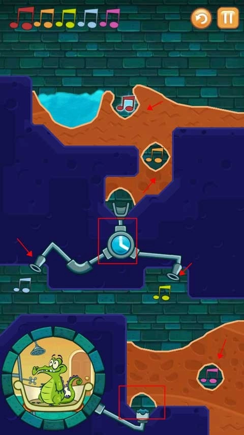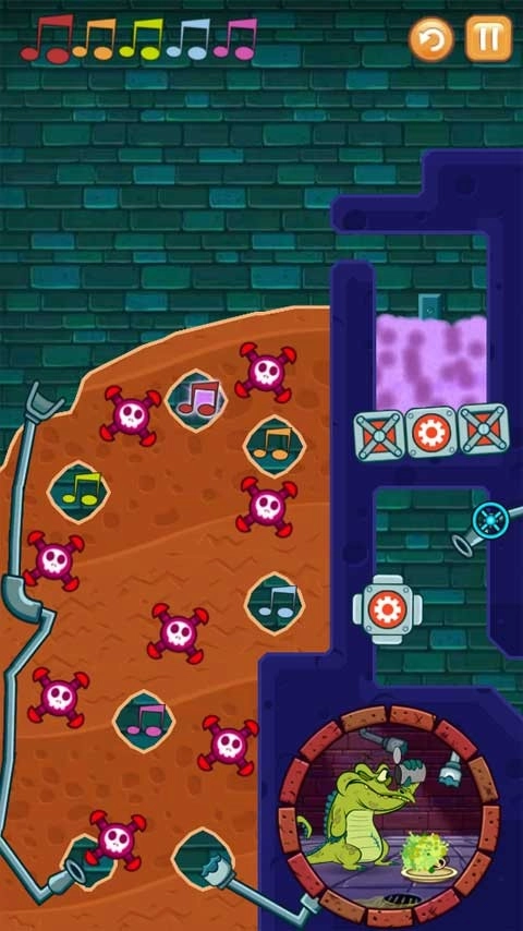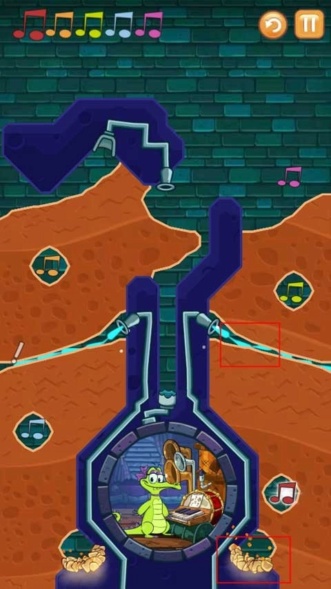 第二个关卡需要按照正确顺序将受污染的水导入所有音符,过程中要留意炸弹爆炸,同时得确保小鳄鱼能有水洗澡。