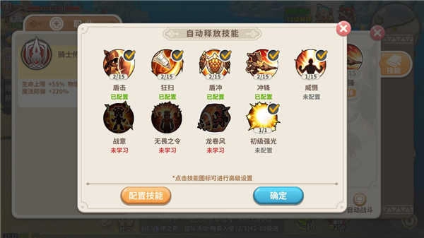 除了技能升级外,在选项窗口的左下方,还能对“配置技能”和“自动战斗”进行调整。
