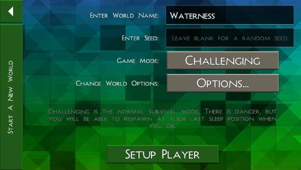 点击“new world”后,我们需要对创建的世界进行自定义设置,设置完成后点击“setup player”