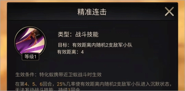 技能目标是有效距离内随机选取的2支敌军小队,该效果同样需在携带近卫蚁战斗时才会生效;初始状态下,第4、5、6回合时,有25%的几率让敌军小队陷入沉默,使其无法发动战斗技能,沉默效果持续1回合;当技能满级后,触发这一效果的几率将提升至70%。