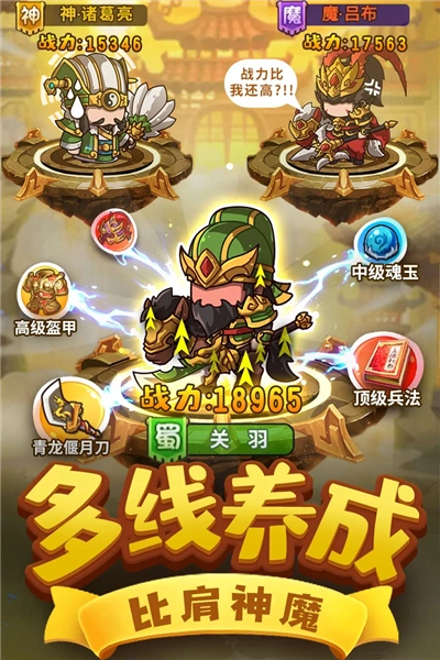 构建多元的武器体系,无论是锐不可当的近战兵刃(如青龙偃月刀、方天画戟),还是极具杀伤力的远程器械(如诸葛连弩、震天弓),每一件武器都具备独特属性与专属成长路径,可借助锻造、升级等方式提升战力。开启全武将招募机制,备受尊崇的五虎上将、智谋超群的卧龙凤雏等名将,皆可收入麾下,用心打造一支职责清晰、实力强劲的常胜三国军团。