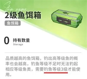 2级鱼饵箱:使用条件为钓鱼等级不低于3级;使用该鱼饵箱时,钓出当前钓鱼等级及以下对应所有产物的概率较低,钓出垃圾的概率相对较高,而钓获3级、4级海产的概率则有显著提升。
