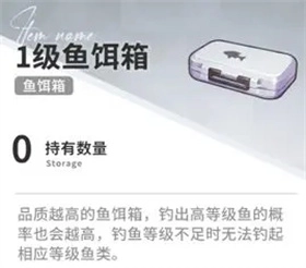 1级鱼饵箱:钓出当前钓鱼等级及以下对应所有产物的概率较低;垃圾、1级海产和2级海产的出现概率会显著提升。