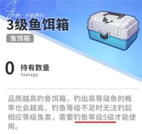 3级鱼饵箱:需钓鱼等级≥5级方可使用,有较低概率钓出不超过当前钓鱼等级对应的所有产物;小概率钓获垃圾,5级、6级海产的出现概率会大幅提升。