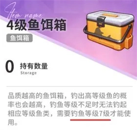 4级鱼饵箱的使用条件是钓鱼等级需达到7级及以上。使用该鱼饵箱时,有较低概率钓获当前钓鱼等级及以下对应的所有产物,小概率钓出垃圾,而钓得7级、8级海产的概率会显著提升。