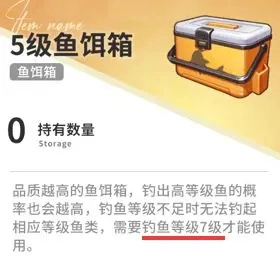 5级鱼饵箱:需钓鱼等级≥7级方可使用,有较低概率钓出不超过当前钓鱼等级对应的所有产物;小概率钓获垃圾,9级、10级海产的出现概率则有大幅提升。