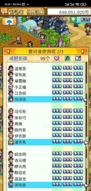 总共有24个人,男女各12名。借助道具能够把所有属性提升至650点,之后就只能依靠便当挂机来增加属性了。三种具有属性加成效果的便当,任意选择一种都可以,并非加力量的便当就仅仅只增加力量,实际上所有属性都能得到提升,属性的最高上限为999点。