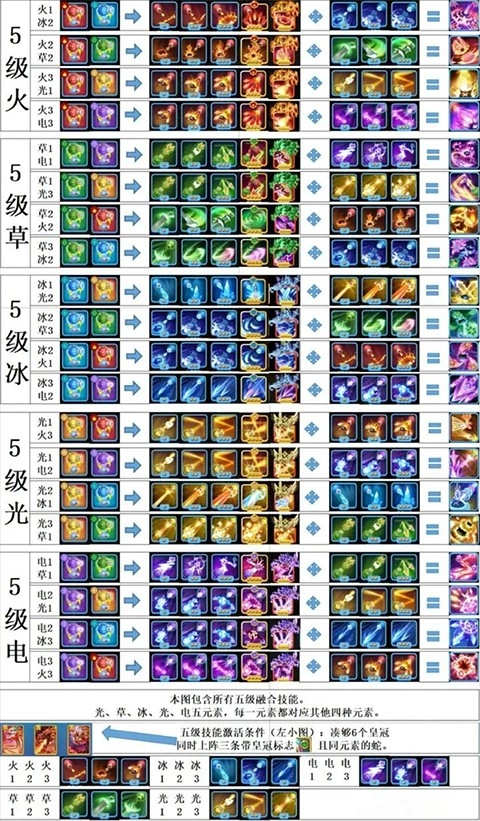 激活五级融合技能的难度更高,要求同时上阵三条带有皇冠标志且元素相同的蛇,并且这三条蛇总共需拥有6个皇冠。在满足上述条件后,再按照对应的元素搭配,就能激活相应的五级融合技能。