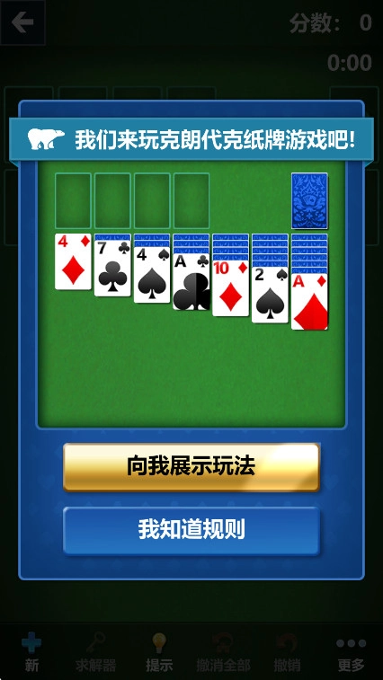 游戏的目标是在四个牌基上分别搭建一套按从小到大顺序排列的牌组,每套对应一种花色。游戏里K是最大的牌,A是最小的,四组牌都得从A开始,到K结束。你可以把牌从一列移到另一列,每列中的牌必须遵循降序且红黑交替的规则,比如黑桃8后面可以接红桃7。左上角有四个空的临时存储单元,你在游戏过程中可以把牌暂时放在这里。一旦把牌移到牌基上,就不能再取回来,所以在移动之前请确认这张牌不再需要。连续的牌组可以像单张牌一样移动到空位,也能移回桌面,因此只有在有足够空位时,你才能移动连续牌组。当有一列是空的时,你可以把任意一张牌移到该列,或者在有足够空位的情况下,把任意连续牌组移到该列。祝你玩得开心!