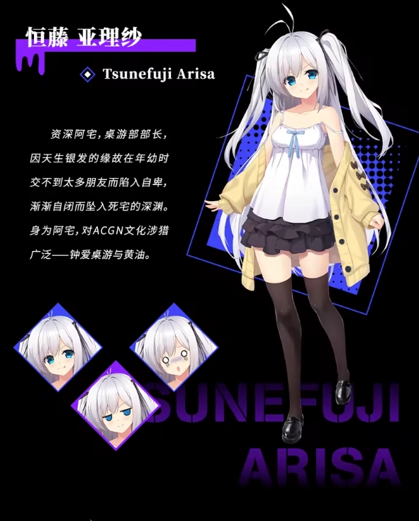 这位资深阿宅同时也是桌游部的部长,由于天生银发,小时候很难交到朋友,因此变得自卑,逐渐封闭自己,最终踏入了死宅的世界。作为一名阿宅,他对ACGN文化有着广泛的了解,尤其喜爱桌游和黄油。