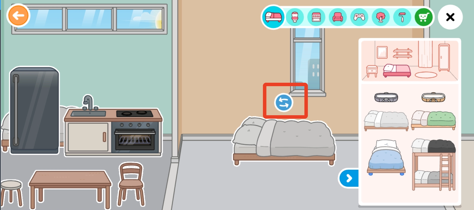 点击家具按钮后,挑选心仪的家具进行拖拽摆放,点击家具上方的箭头就能调整其方向。