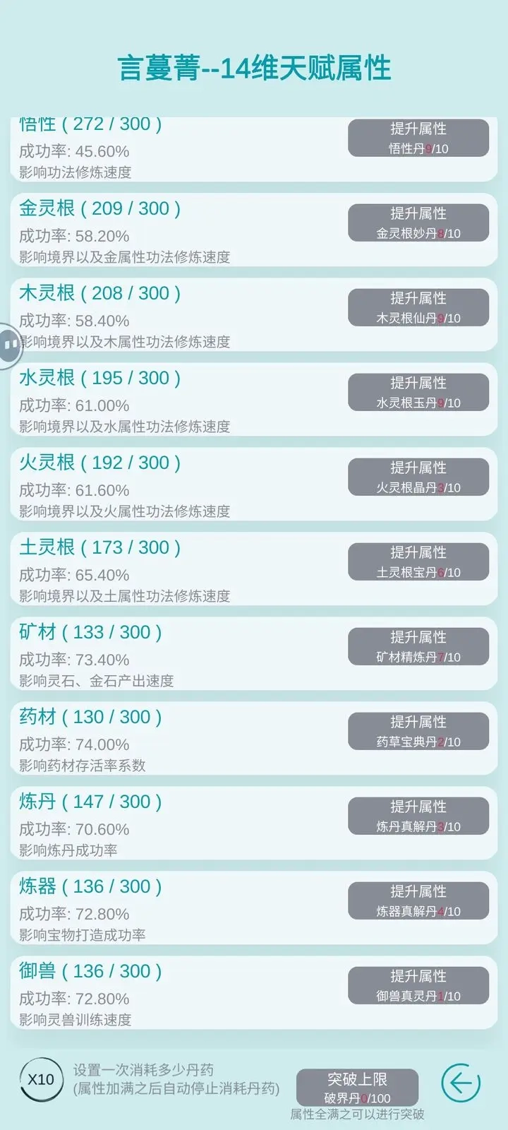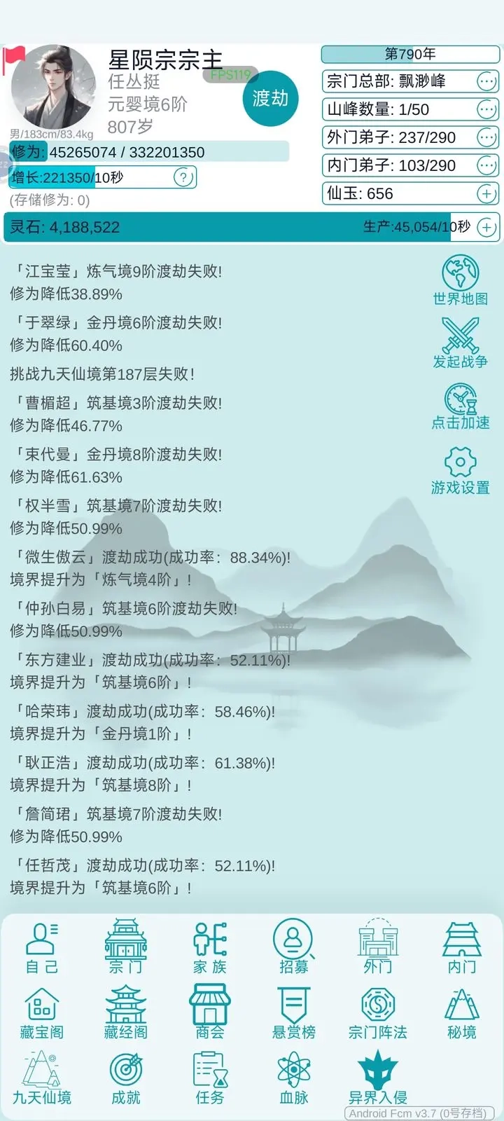2,前期的核心任务是刷属性丹药,要把主角的灵根、气感、悟性这三项属性都刷到290的满值。目前还无法更换宗主,因为游戏里的所有系统都和宗主的境界挂钩,所以优先提升境界才是关键。