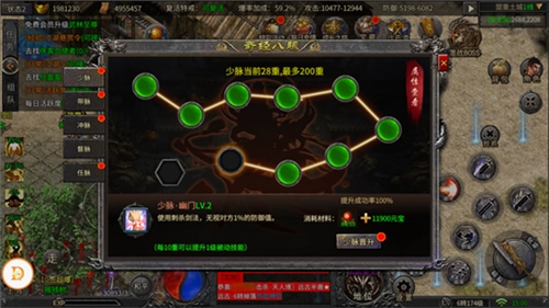 督脉:等级上限为20级,1级细分为10重。每提升一重,可增加0.5%的HP与0.5%的减角伤害;每积累5重,额外增加1点准确。升级所需材料为督脉·根骨丹。