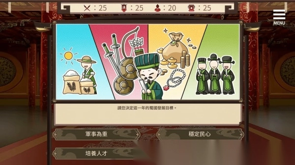 这款游戏以策略经营为核心玩法,玩家需为刘禅规划国家后续的发展路径,全力提升各项指标的数值表现,从而主导剧情朝着自己期望的方向推进。