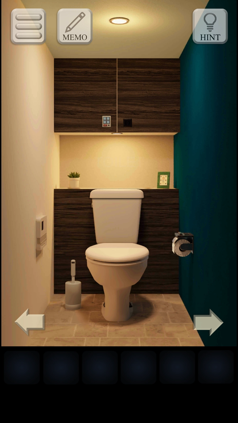 右转两次,查看马桶后面相框,点击相框查看其背面。
