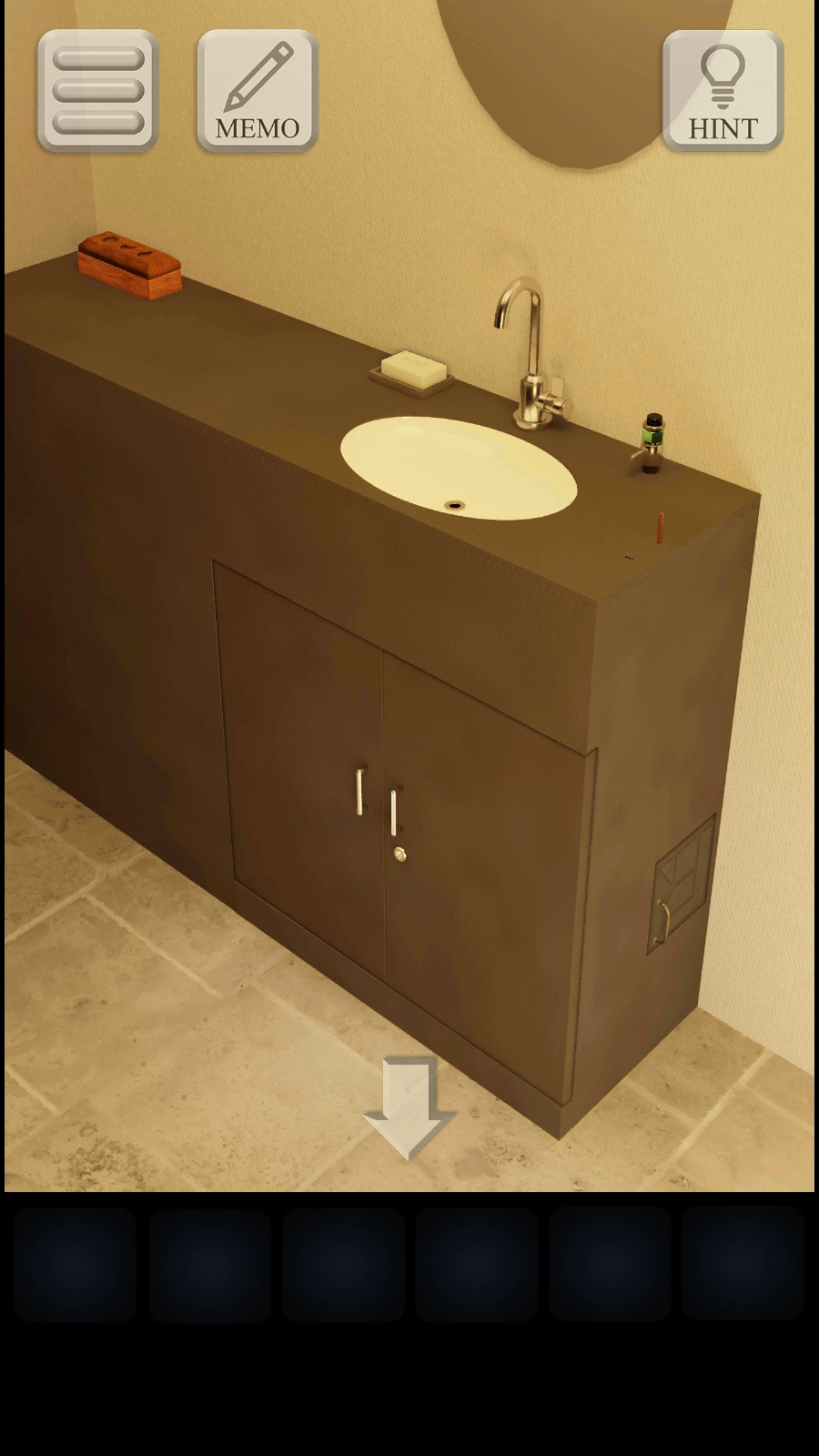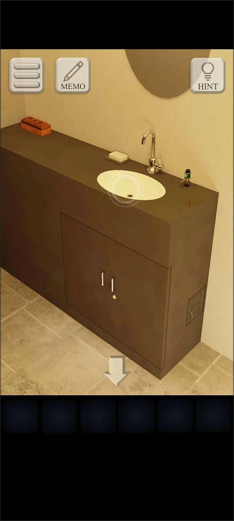 向左转到门口位置,拿出【钥匙】打开洗手池下方的柜子,从里面取走【半块带有苹果图案的物品】。