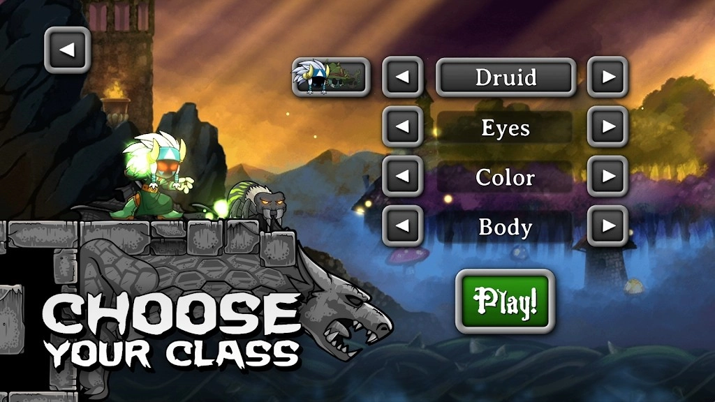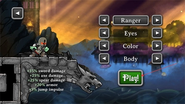 在角色定制界面挑选职业,完成属性配置后,点击【Play!】按钮即可进入关卡。