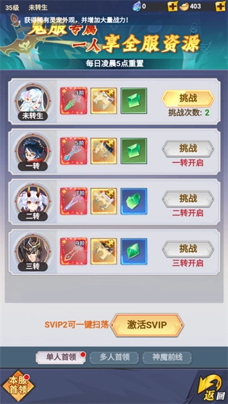 挑战【单人首领、多人首领、神魔前线】等副本以获取对应奖励,通过积累资源来提升战力【SVIP2享有一键扫荡功能】。