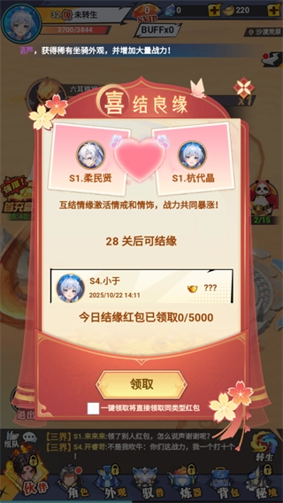 参与【喜结良缘】系统,能激活互结情缘功能,进而解锁情戒与情饰,双方战力可一同飙升,此外还可领取结缘红包。