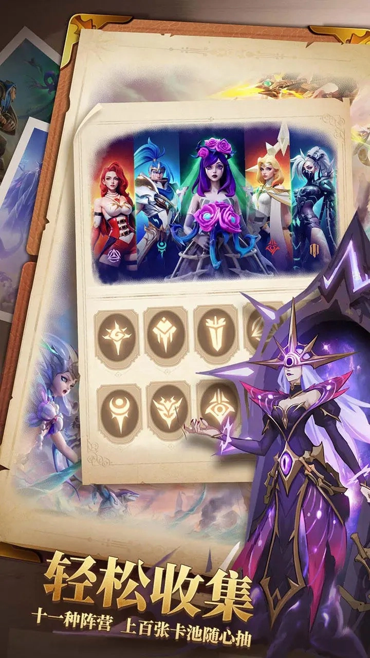游戏里的角色设有三种标志:一是防守、进攻、辅助这三类角色定位;二是4种类似属性克制机制的角色印记;三是10个各有不同的所属势力。当相同势力的英雄同时登场时,队伍能获得额外加成,而且不同势力对应的阵营加成效果有差异,上场的同势力英雄人数越多,加成效果也会越强。