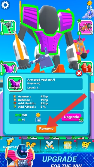 这里展示了一件名为“Armoredvestmk.”的装备,它的等级是1级,能提供41点生命值和14点防御,同时还能增加21点生命值以及9%的攻击力。在装备界面上,设有“Upgrade”(升级)和“Remove(移除)”这两个操作选项。