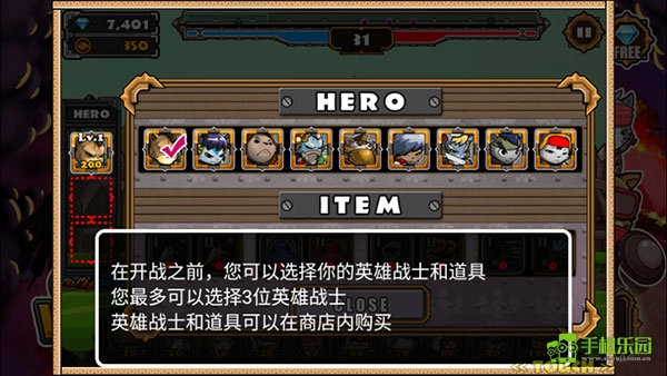 开战前,你可以挑选英雄战士与道具,最多能选3位英雄战士,这些英雄和道具都能在商店里购买。