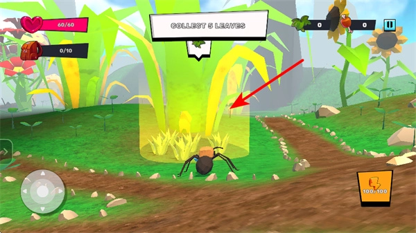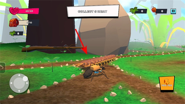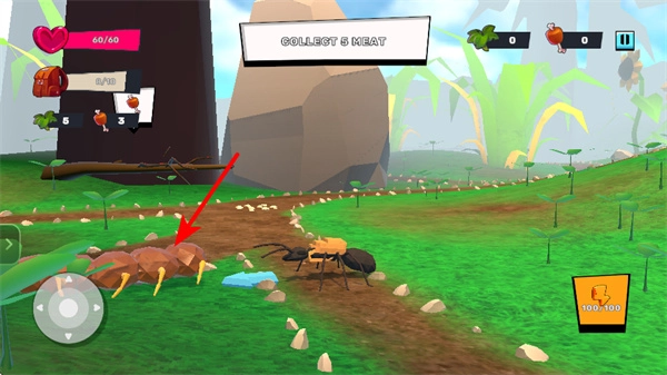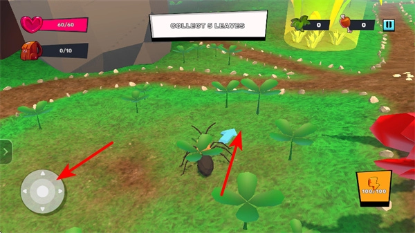 进入游戏后,操控箭头所指示的摇杆,这是控制角色移动的核心操作,拖动它就能让蚂蚁朝着目标方向前进。