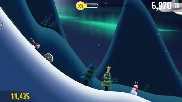 游戏屏幕上方会显示当前的奖励状态,玩家在滑行时收集金币、完成高难度动作等,都能填充奖励状态,从而激活火箭船等各类高级工具。不仅如此,玩家还能和企鹅、雪怪人一起搭乘火箭船,结伴飞向远方。