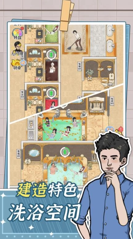 《浴场之王》是一款趣味性十足的经营类游戏,玩家将以经营者的身份打造专属洗浴中心。游戏内提供丰富多样的设施供玩家建造,还有源源不断的顾客等待服务,更有大量员工角色可解锁招募。此外,各类风格的装饰物品任你自由搭配,你可以不断拓展浴场规模,最终打造出最出色的洗浴中心。