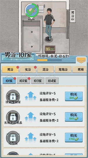 进入游戏后,点击下方第一个按钮即可升级浴场,解锁各类装饰物品。
