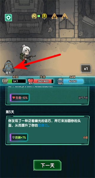 进入游戏场景后,先阅读剧情提示,再点击下一天按钮,以此推进游戏进程,解锁后续的生存事件与探索内容。