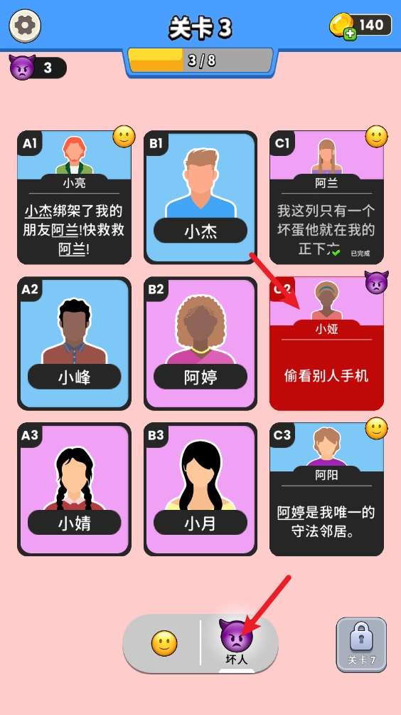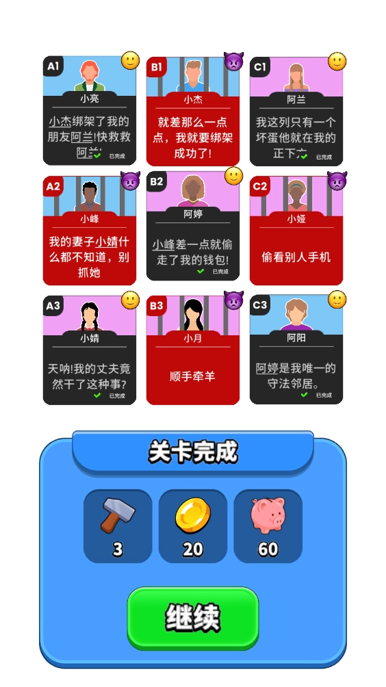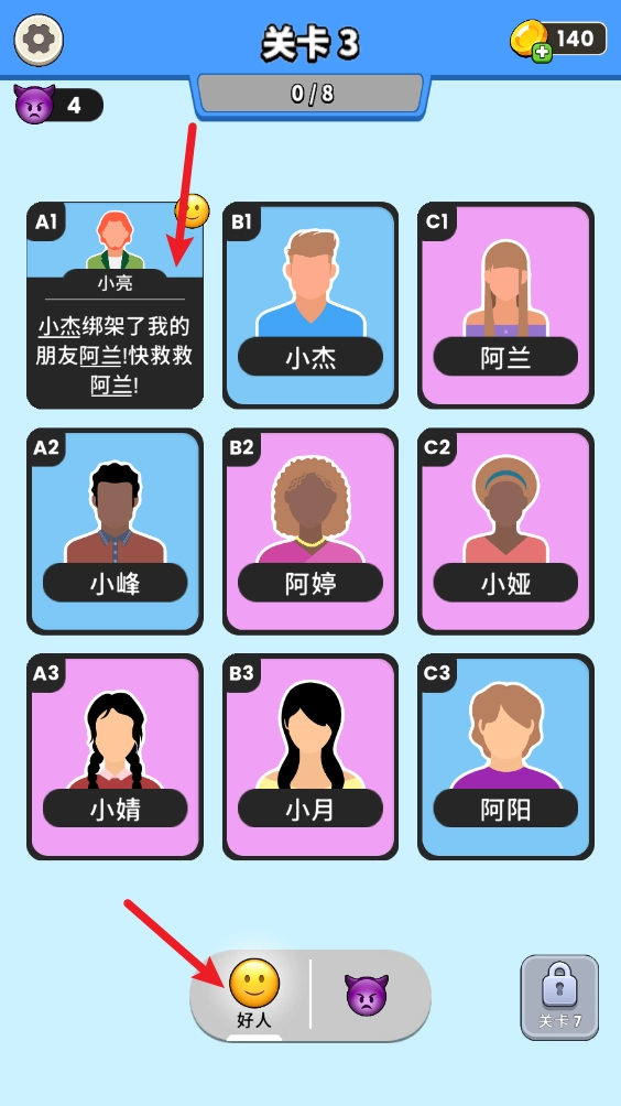 仔细留意每一位角色的信息,依据这些信息展开综合判断,把所有的好人和坏人区分开来!