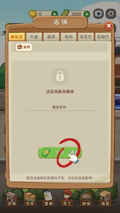 首先要清理排队区域,点击左下角的【店铺】,用500元完成清洁工作。