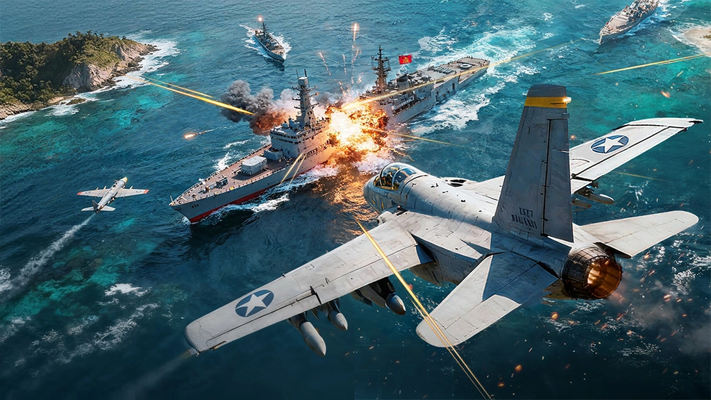 呼叫舰载机掠过低垂的浪尖,同时对敌舰实施俯冲轰炸与电子干扰;舰炮从正面撕开防线,空袭则从背面灌顶打击,让整个战场在立体攻势下熊熊燃烧。