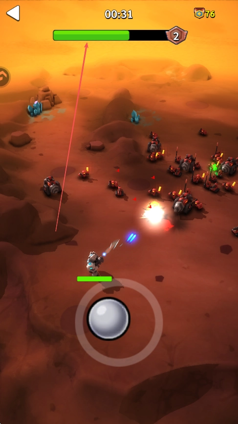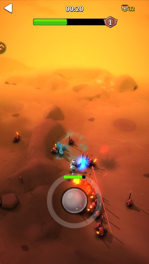 收集击败敌人后掉落的黄色道具,提升资源数量,利用资源强化角色,完成关卡目标。