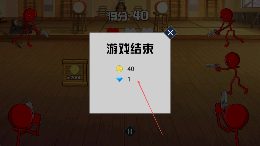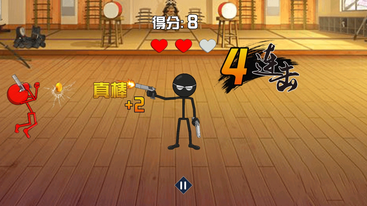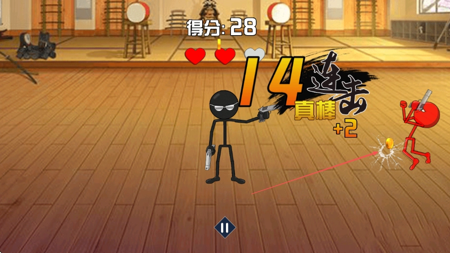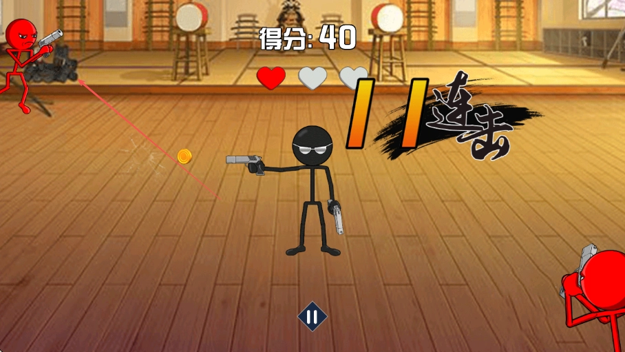 进入游戏后,操控黑色火柴人英雄,对准左侧出现的红色敌人进行射击以获取分数,此时屏幕上方会显示当前得分40,并且伴有连击效果。
