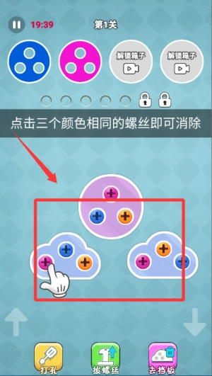 操作十分简单,容易上手,借助触摸屏就能完成拧螺丝的动作,不需要复杂的指令,各类玩家都能快速适应。关卡的设计遵循由浅入深的原则,初期主要侧重于教学引导。