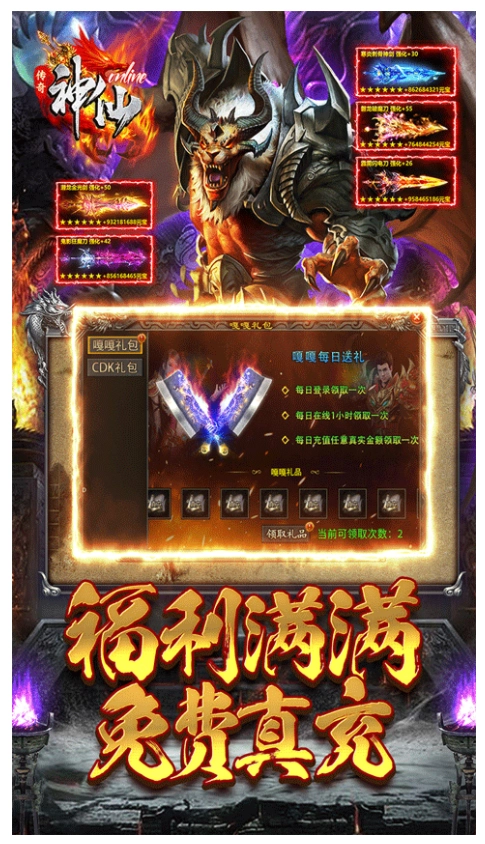 玩家开局就能拿到一把大菜刀作为初始武器,每日签到即可领取百万元宝与上千灵符,助力快速升级,轻松闯过新手阶段。游戏内包含丰富有趣的传奇玩法,完成登录操作后,更有海量奖励持续发放,还有更多精彩冒险等待解锁。