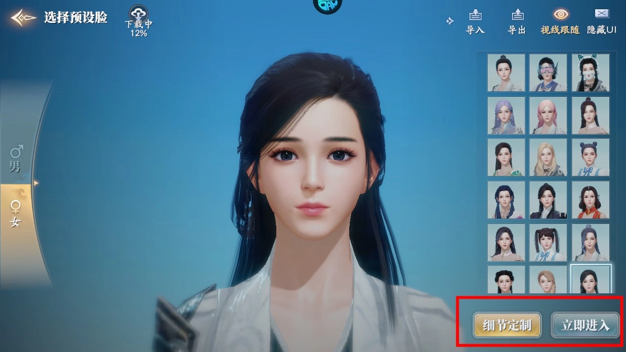 玩家进入游戏后的首要任务是创建一个专属角色,左侧可选择性别,右侧能挑选模型,并且系统支持模型的导入与导出功能。