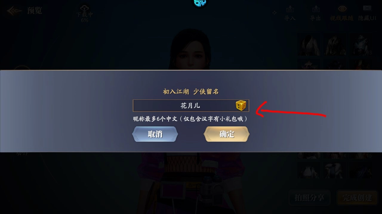 接下来就是给角色起名的环节啦,要是起一个汉文名字,还能额外领取一份小礼包呢。你看界面上有个骰子按钮,点击它就能随机生成名字啦。