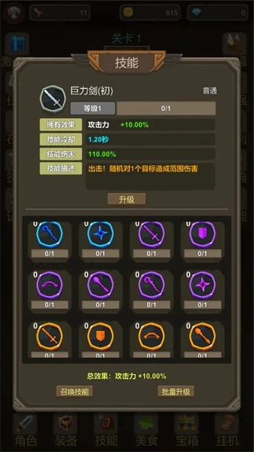 武器大作战最新版本的玩法十分护肝,游戏内拥有丰富多样的武器与技能,宝箱中藏着不少惊喜。它采用放置挂机的游玩方式,武器能够自动发起攻击,技能升级速度快,并且支持批量升级操作。战斗模式别具一格,各类怪物都能被轻松击败!