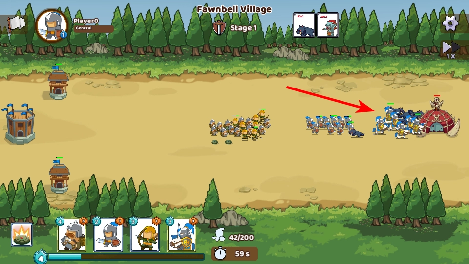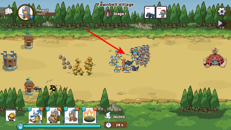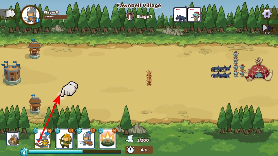 部署士兵时,在战斗界面点击对应的士兵卡牌,然后把士兵放置到战场的指定位置,以此组成战斗阵型。