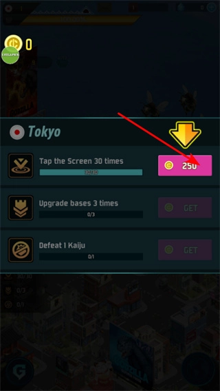 完成点击屏幕30次的任务后,点击奖励按钮领取任务奖励,即可获取250金币,这些金币可积累起来用于后续建设。