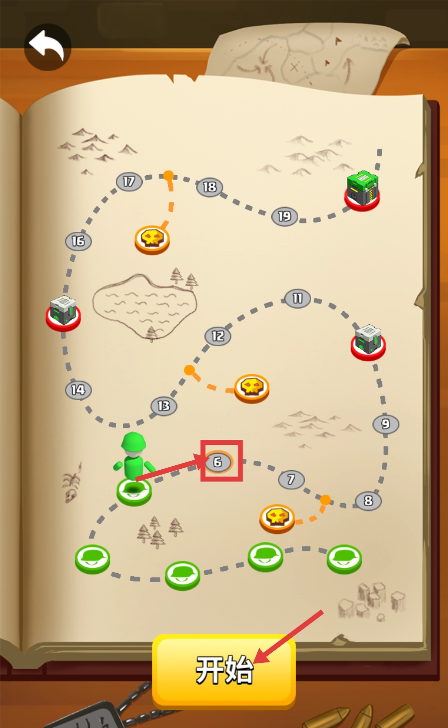 在关卡地图里选择【6-关】,点击下方的【开始】按钮就能进入战斗,按照地图路径逐步推进就能解锁后面的关卡。