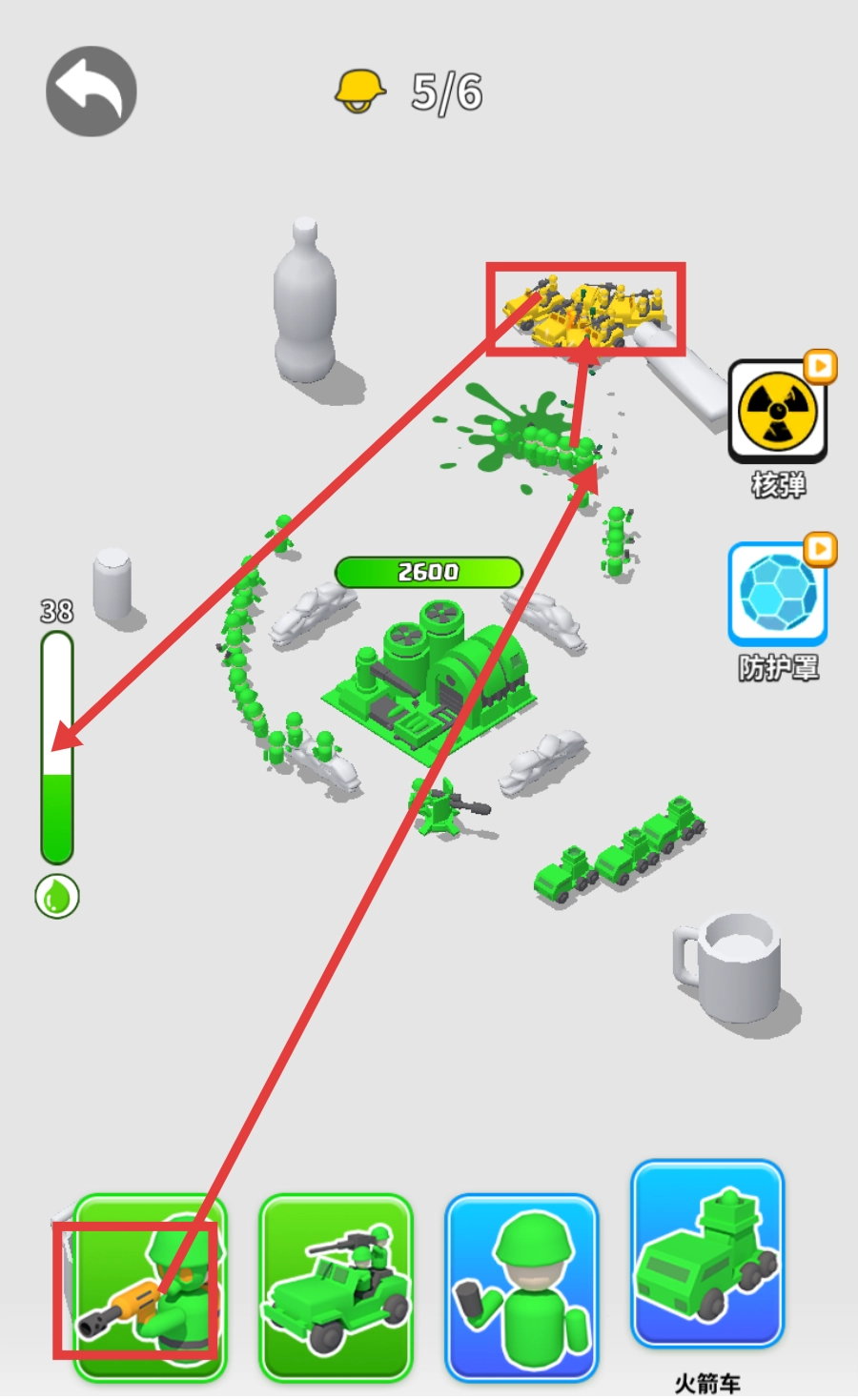 留意【头盔-3/6】的剩余数量,在合适的时机运用【核弹】与【防护罩】,以此来抵御敌方的进攻,确保我方能够生存下来。