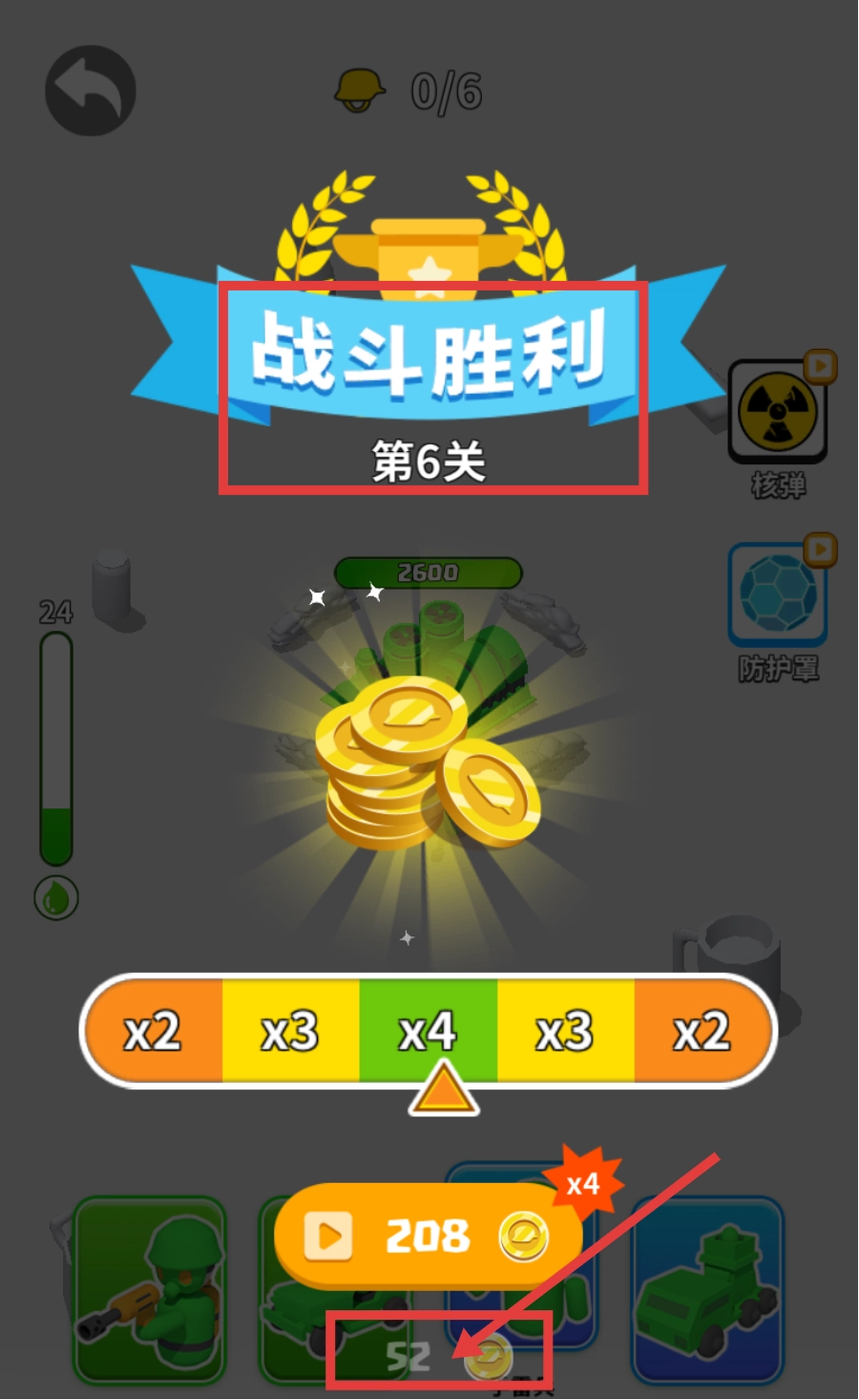在完成【战斗胜利-第6关】的挑战后,可领取【金币-52】的奖励,这些资源可用于兵种升级或进一步获取更多资源。