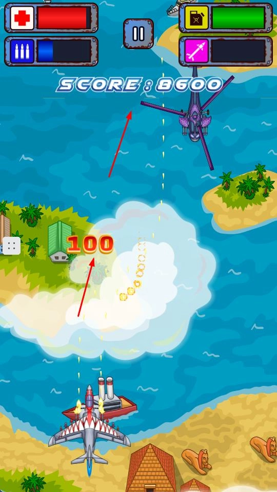 攻击并摧毁敌方飞机、直升机等目标,可提升分数,分数会实时显示在界面上方,以此记录战斗成果。